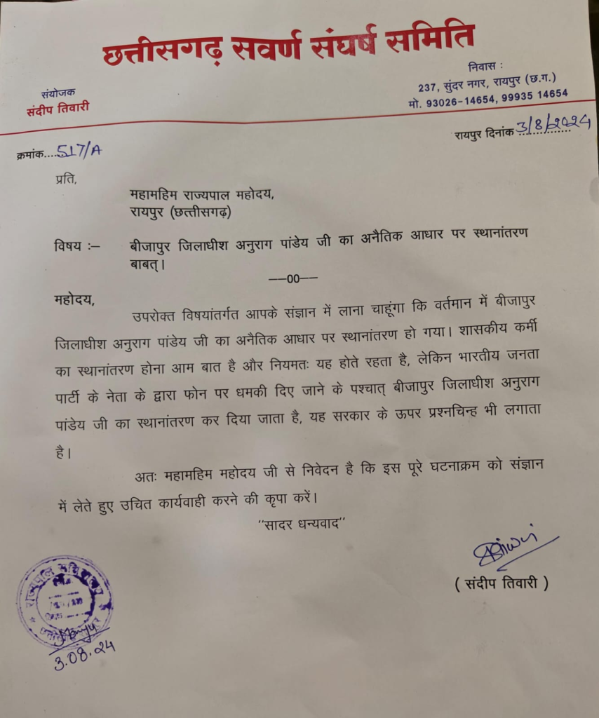 “छत्तीसगढ़ सवर्ण संघर्ष समिति ने राज्यपाल को बीजापुर जिलाधीश के अनैतिक स्थानांतरण के खिलाफ ज्ञापन सौंपा”