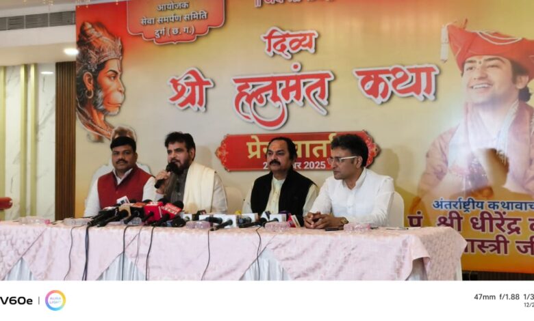 रायपुर- इस्पात नगरी भिलाई पहली बार सनातन धर्म के ध्वजवाहक पंडित श्री धीरेंद्र कृष्ण शास्त्री जी के दिव्य आगमन की साक्षी बनने जा रही है। 25 से 29 दिसंबर 2025 तक जयंती स्टेडियम के समीप ग्राउंड, भिलाई में दिव्य श्री हनुमंत कथा का भव्य आयोजन किया जा रहा है, जिसमें पंडित शास्त्री जी प्रतिदिन दोपहर 2 बजे से शाम 6 बजे तक श्रद्धालुओं को कथा का रसपान कराएंगे। जिसे लेकर श्री हनुमंत कथा के आयोजक एवं छत्तीसगढ़ खादी ग्राम उद्योग आयोग के अध्यक्ष राकेश पाण्डेय द्वारा होटल बेबीलान में आयोजित प्रेस वार्ता को संबोधित करते हुए कहा कि कथा के अंतर्गत 27 दिसंबर को विशेष दिव्य दरबार का आयोजन होगा, जिसमें पंडित शास्त्री जी श्रद्धालुओं की पर्ची निकालकर समस्याओं के समाधान हेतु मार्गदर्शन प्रदान करेंगे।